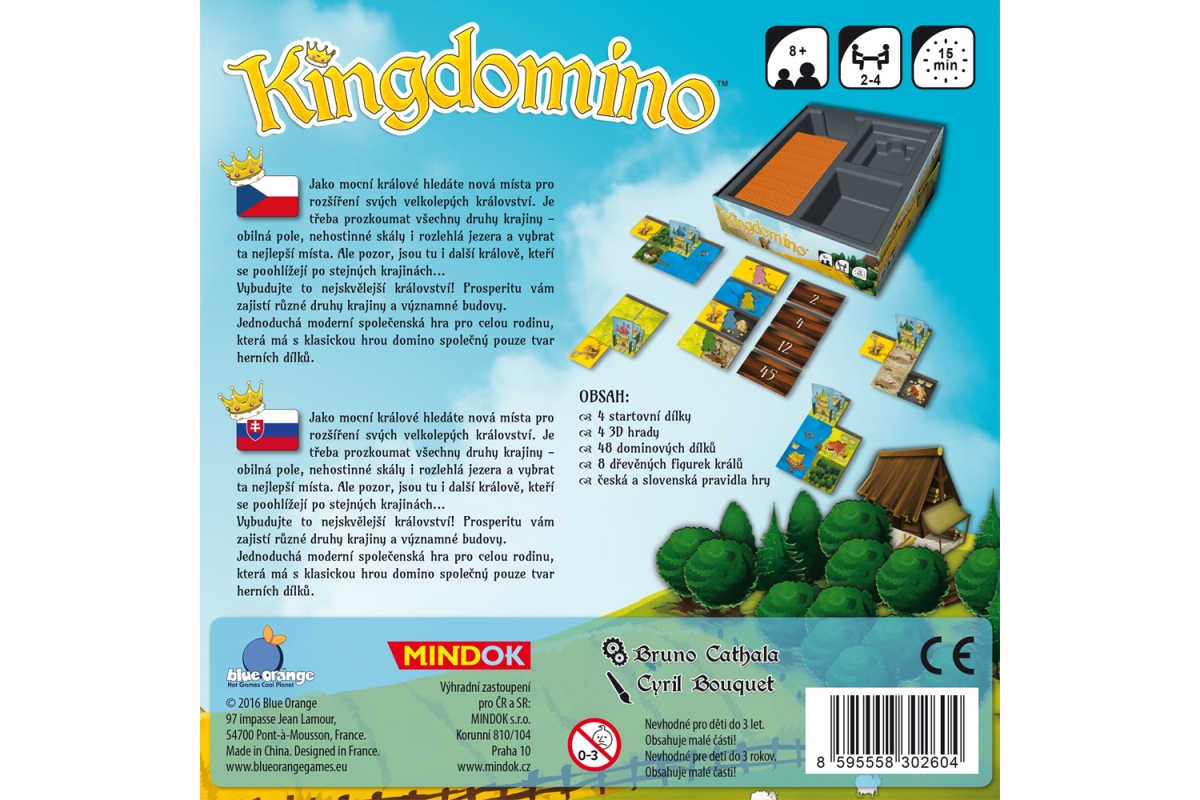 Jako mocní králové hledáte nová místa pro rozšíření svých velkolepých království. Je třeba prozkoumat všechny druhy krajiny - obilná pole, nehostinné skály i rozlehlá jezera a vybrat ta nejlepší místa. Ale pozor, jsou tu i další králové, kteří se poohlížejí po stejných krajinách... Vybudujte to nejskvělejší království! Prosperitu vám zajistí různé druhy krajiny a významné budovy. Jednoduchá moderní společenská hra pro celou rodinu, která má s klasickou hrou domino společný pouze tvar herních dílků. Věk 8+. Pro 2-4 hráče. Doba hraní cca 15 minut. Hra obsahuje: 4 startovní dílky, 4 3D hrady, 48 dominových dílků, 8 dřevěných figurek králů, česká a slovenská pravidla hry.