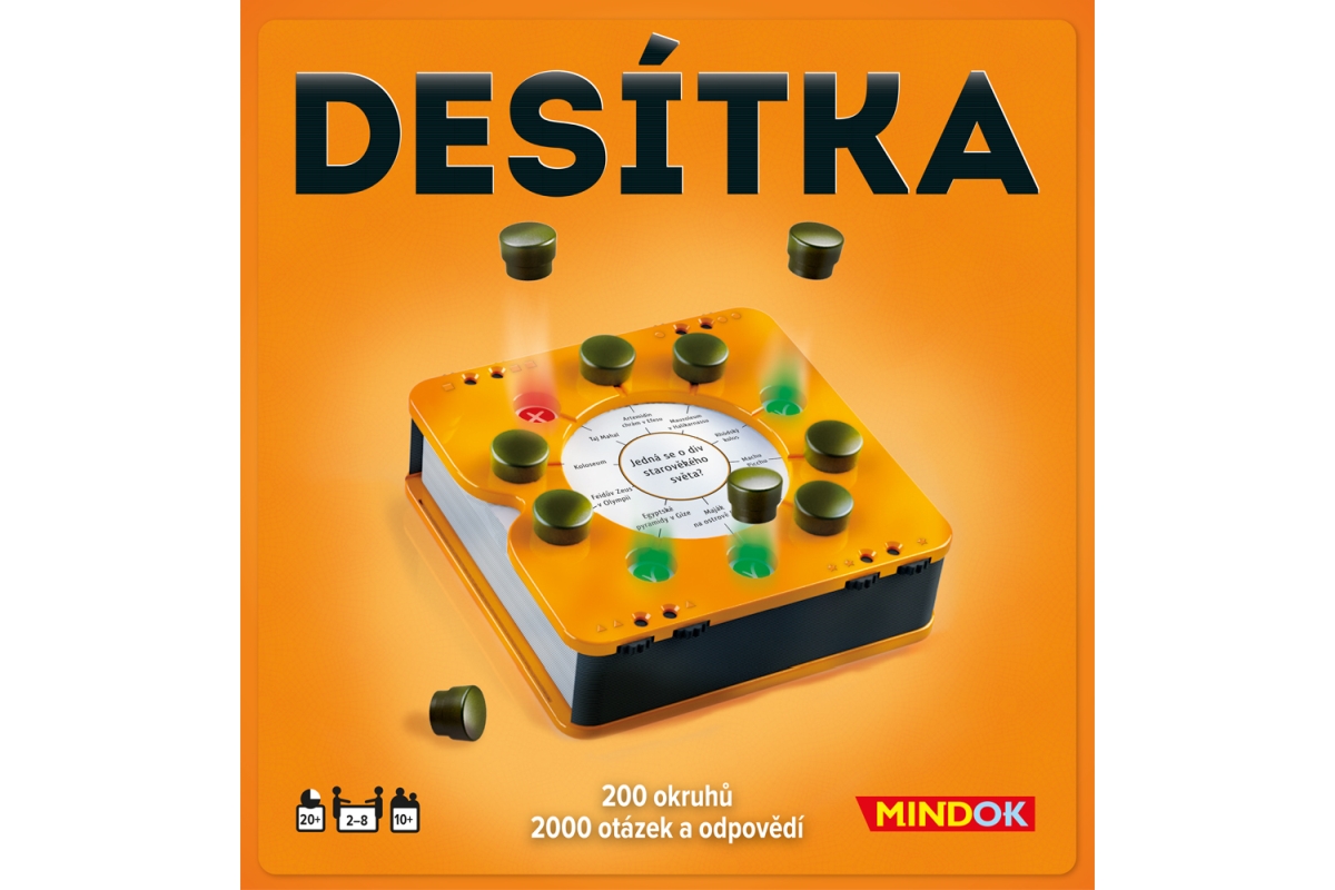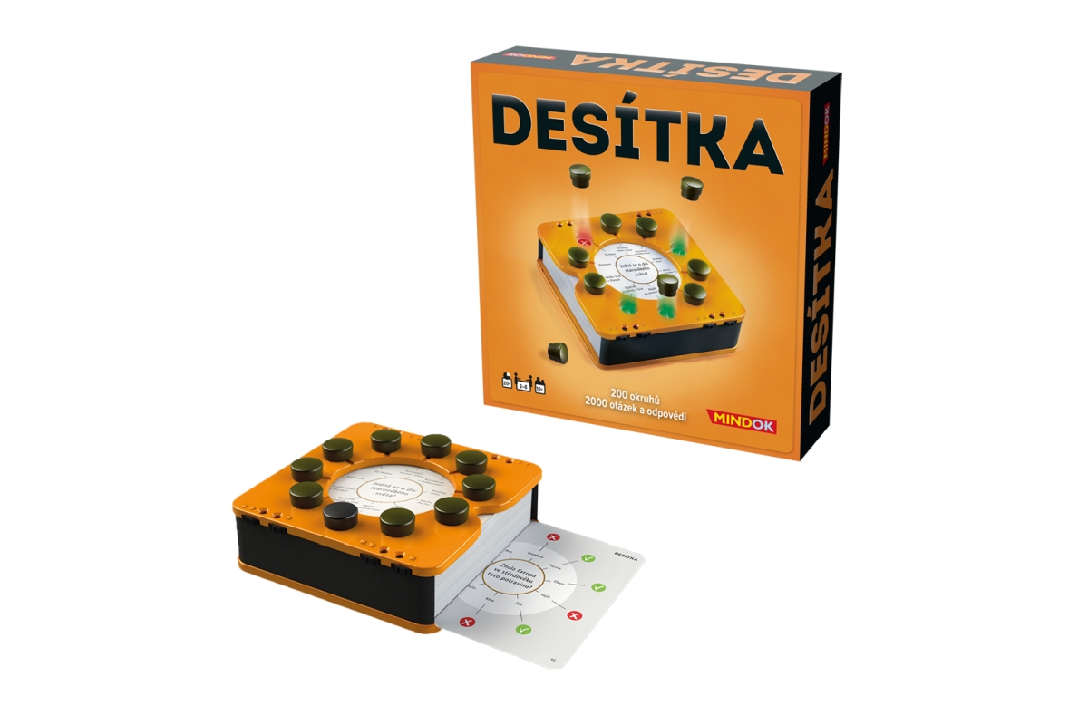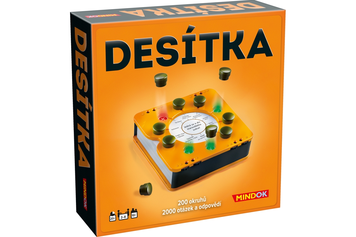 Ve hře DESÍTKA hráči nemusejí čekat na svůj tah tak dlouho jako v jiných hrách. Ke každému okruhu ve hře přísluší 10 otázek a 10 možných odpovědí. Všichni hráči dostanou šanci odpovídat v každém okruhu otázek. Pokud odpovíte správně, získáte jeden z žetonů odpovědí jako bod. Když jste znovu na tahu, můžete hledat další správnou odpověď. V tu chvíli ovšem podstupujete riziko, že body získané dříve v tomto okruhu ztratíte. Budete hrát na jistotu, nebo riskovat? Ve hře je 200 okruhů, 2000 otázek a 2000 možných odpovědí. To vše v kompaktním balení zvaném smartbox s počítadly bodů a žetony odpovědí. Desítka je skvělá hra, obzvláště vhodná i na cesty. Pro 2 - 8 hráčů. Časová náročnost cca 20 minut. Věk 10+