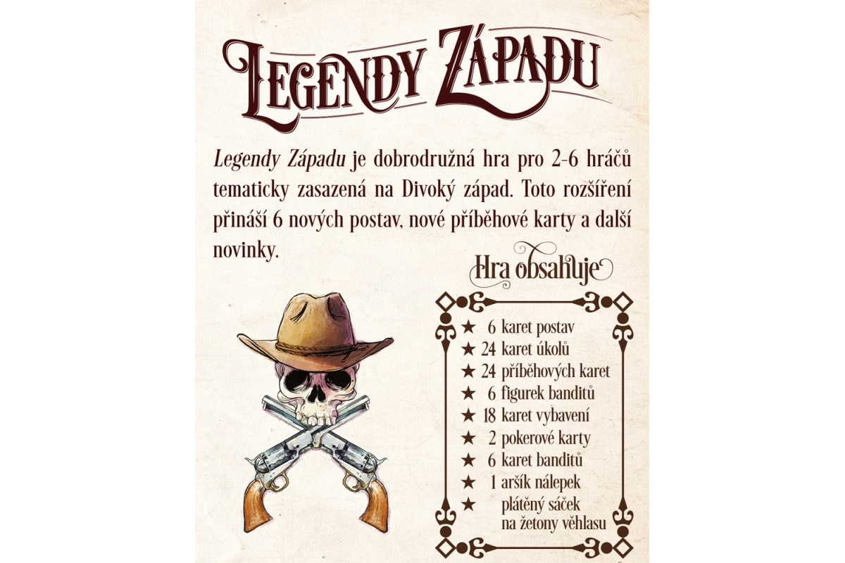 Legendy Západu je dobrodružná hra pro 2–6 hráčů tematicky zasazená na Divoký západ. Toto rozšíření přináší 6 nových postav, nové příběhové karty a dal..