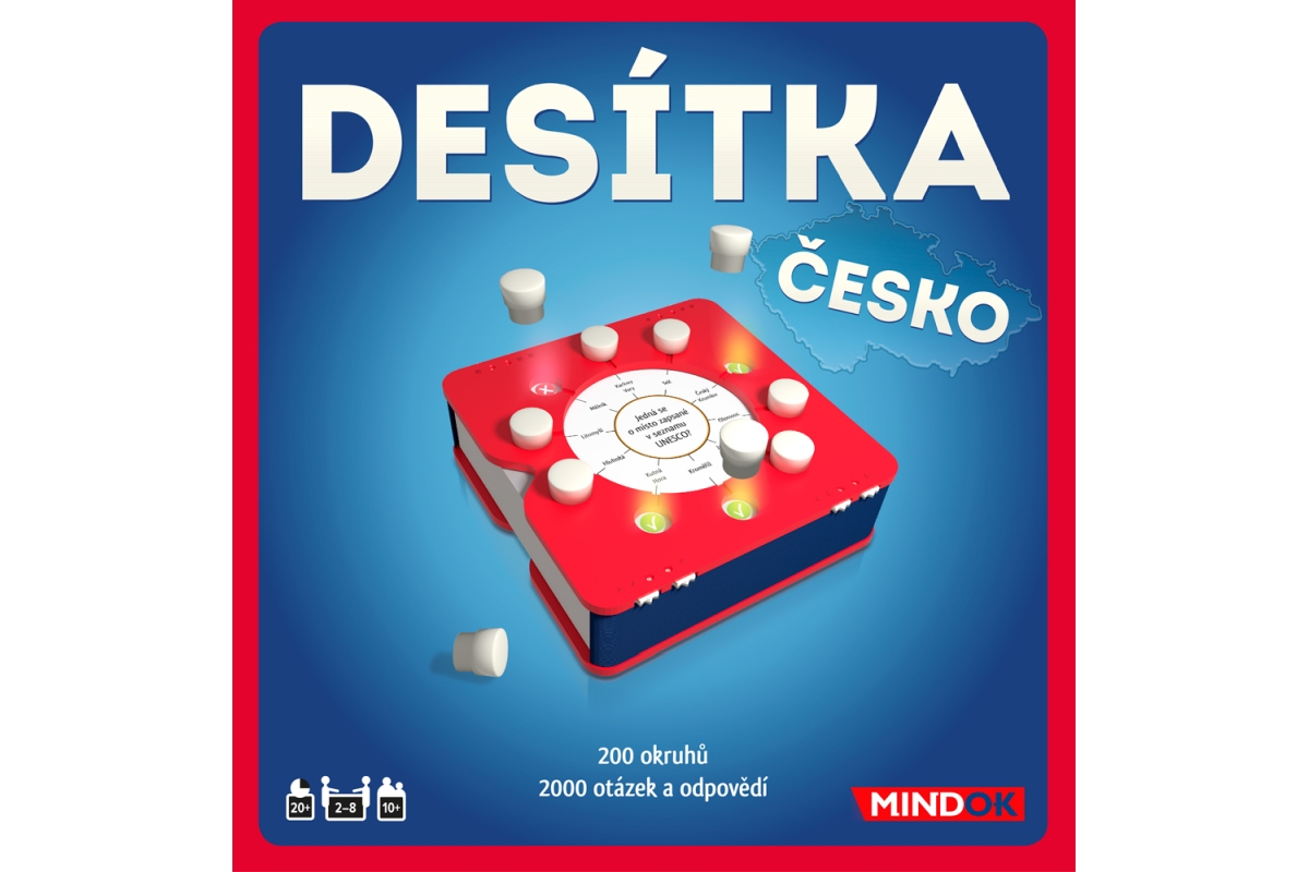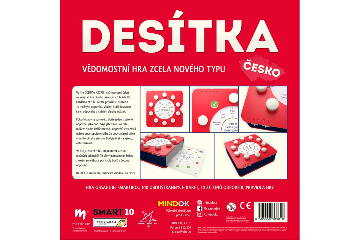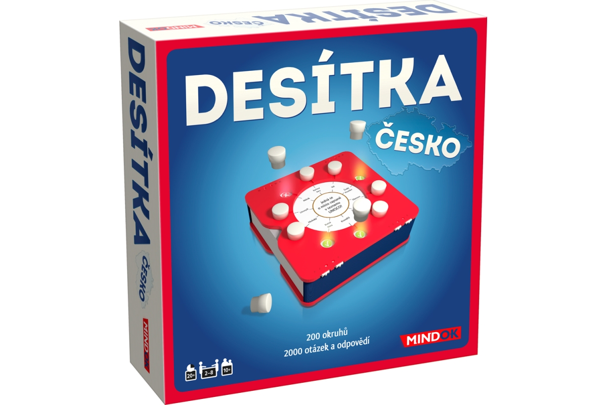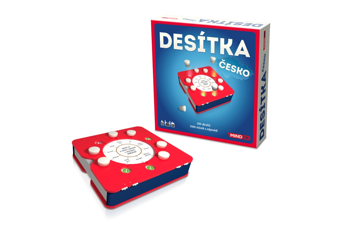 Ve hře DESÍTKA: ČESKO hráči nemusejí čekat na svůj tah tak dlouho jako v jiných hrách. Ke každému okruhu ve hře přísluší 10 otázek a 10 možných odpovědí. Všichni hráči dostanou šanci odpovídat v každém okruhu otázek. Pokud odpovíte správně, získáte jeden z žetonů odpovědí jako bod. Když jste znovu na tahu, můžete hledat další správnou odpověď. V tu chvíli ovšem podstupujete riziko, že body získané dříve v tomto okruhu ztratíte. Budete hrát na jistotu, nebo riskovat? Ve hře je 200 okruhů, 2000 otázek a 2000 možných odpovědí. To vše v kompaktním balení zvaném smartbox s počítadly bodů a žetony odpovědí. Desítka je skvělá hra, obzvláště vhodná i na cesty. Věk 10+