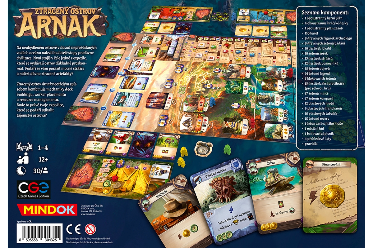 Na neobydleném ostrově v dosud neprobádaných vodách oceánu nalezli badatelé stopy pradávné civilizace. Nyní stojíš v čele jedné z expedic, které se vydávají ostrov důkladně prozkoumat. Podaří se vám porazit mocné strážce a nalézt dávno ztracené artefakty? Ztracený ostrov Arnak neotřelým způsobem kombinuje mechaniky deck buildingu, worker placementu a resource managementu. Bude to právě tvoje expedice, které se podaří odhalit tajemství ostrova?