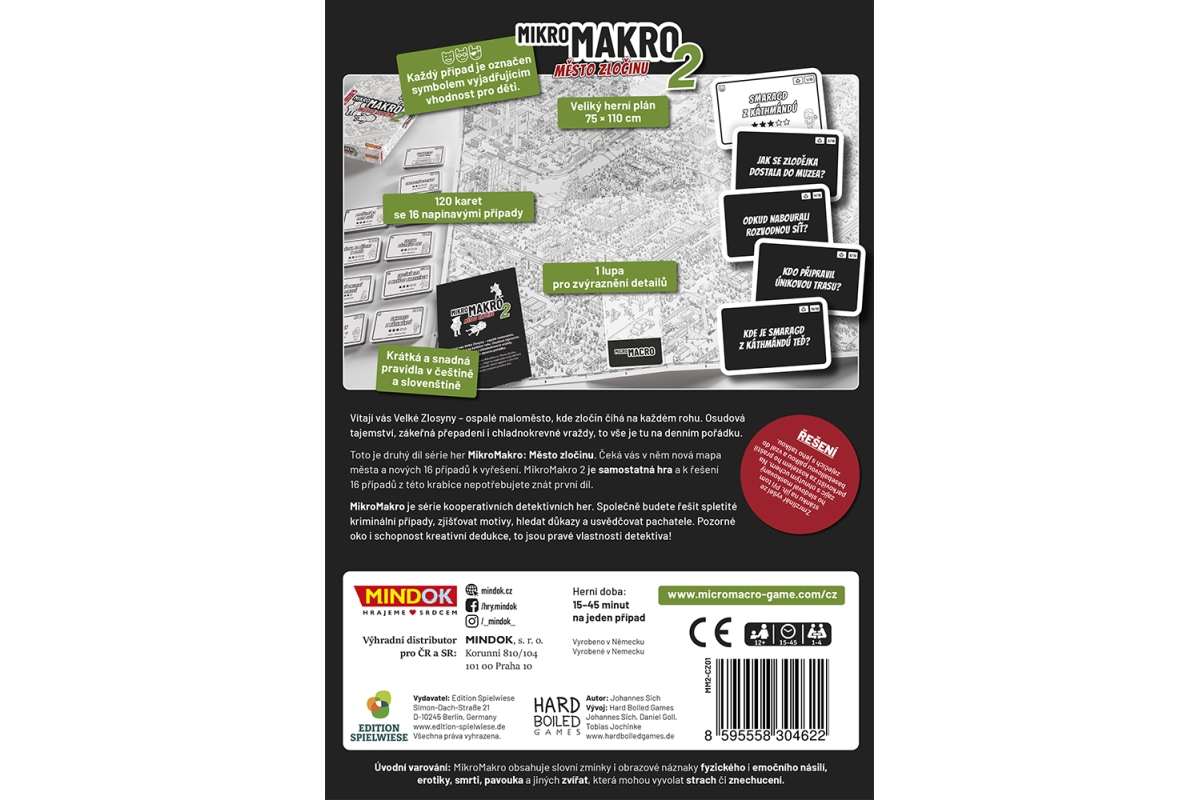 Vítají vás Velké Zlosyny – ospalé maloměsto, kde zločin číhá na každém rohu. Osudová tajemství, zákeřná přepadení i chladnokrevné vraždy, to vše je tu na denním pořádku. Toto je druhý díl série her MikroMakro: Město zločinu. Čeká vás v něm nová mapa města a nových 16 případů k vyřešení. MikroMakro 2 je samostatná hra a k řešení 16 případů z této krabice nepotřebujete znát první díl. MikroMakro je série kooperativních detektivních her. Společně budete řešit spletité kriminální případy, zjišťovat motivy, hledat důkazy a usvědčovat pachatele. Pozorné oko i schopnost kreativní dedukce, to jsou pravé vlastnosti detektiva! Věk 12+