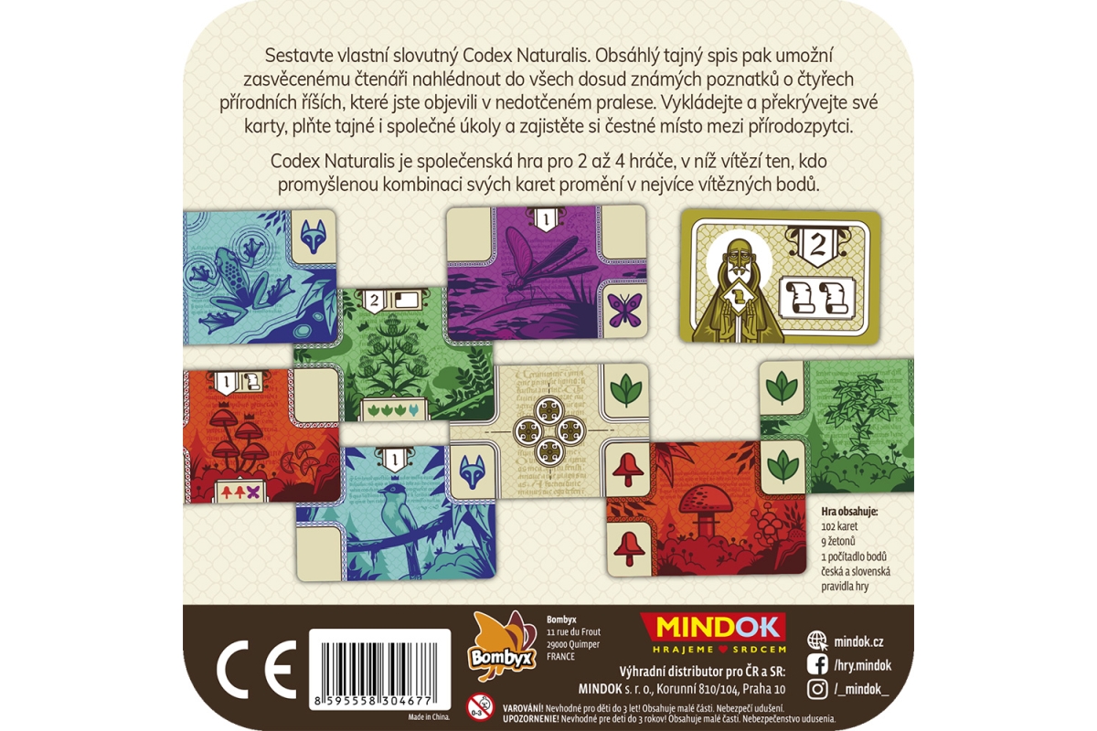 Sestavte vlastní slovutný Codex Naturalis. Obsáhlý tajný spis pak umožní zasvěcenému čtenáři nahlédnout do všech dosud známých poznatků o čtyřech přírodních říších, které jste objevili v nedotčeném pralese. Vykládejte a překrývejte své karty, plňte tajné i společné úkoly a zajistěte si čestné místo mezi přírodozpytci. Codex Naturalis je společenská hra pro 2 až 4 hráče, v níž vítězí ten, kdo promyšlenou kombinaci svých karet promění v nejvíce vítězných bodů. Rozměr balení cca 13 x 13 x 4 cm. Věk 7+