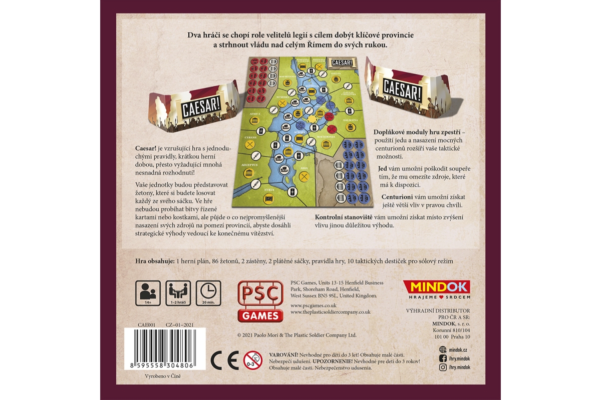Dva hráči se chopí role velitelů legií s cílem dobýt klíčové provincie a strhnout vládu nad celým Římem do svých rukou. Caesar! je vzrušující hra s jednoduchými pravidly, krátkou herní dobou, přesto vyžadující mnohá nesnadná rozhodnutí! Vaše jednotky budou představovat žetony, které si budete losovat každý ze svého sáčku. Ve hře nebudou probíhat bitvy řízené kartami nebo kostkami, ale půjde o co nejpromyšlenější nasazení svých zdrojů na pomezí provincií, abyste dosáhli strategické výhody vedoucí ke konečnému vítězství. Doplňkové moduly hru zpestří – použití jedu a nasazení mocných centurionů rozšíří vaše taktické možnosti. Jed vám umožní poškodit soupeře tím, že mu omezíte zdroje, které má k dispozici. Centurioni vám umožní získat ještě větší vliv v pravou chvíli. Kontrolní stanoviště vám umožní získat místo zvýšení vlivu jinou důležitou výhodu. Rozměr balení cca 21,5 x 21,5 x 5,5 cm. Věk 14+