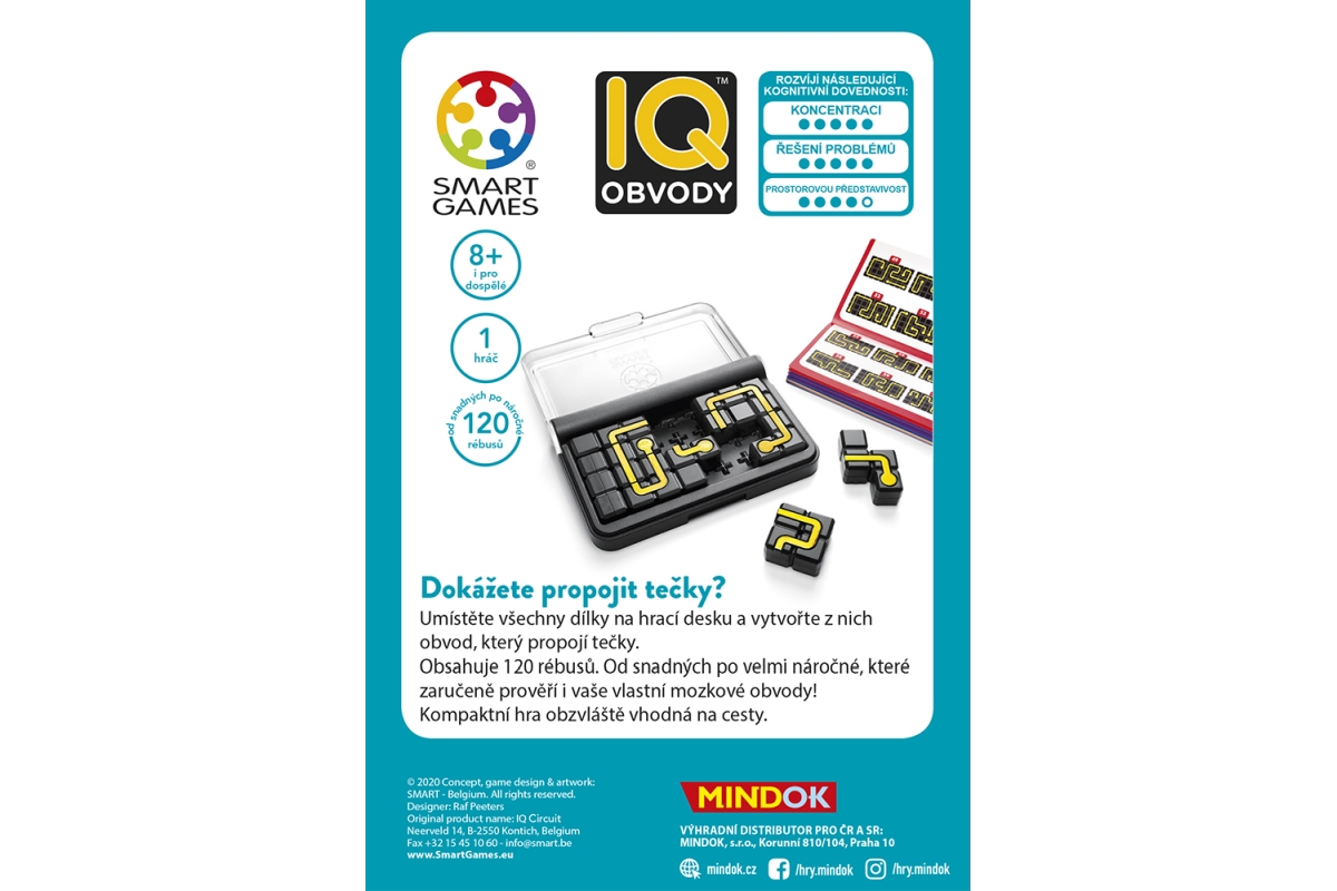 Dokážete propojit tečky? Umístěte všechny dílky na hrací desku a vytvořte z nich obvod, který propojí tečky. Obsahuje 120 rébusů. Od snadných po velmi náročné, které zaručeně prověří i vaše vlastní mozkové obvody. Kompaktní hra obzvláště vhodná na cesty. Rozměr balení cca 10 x 14,5 x 3 cm. Věk 8+