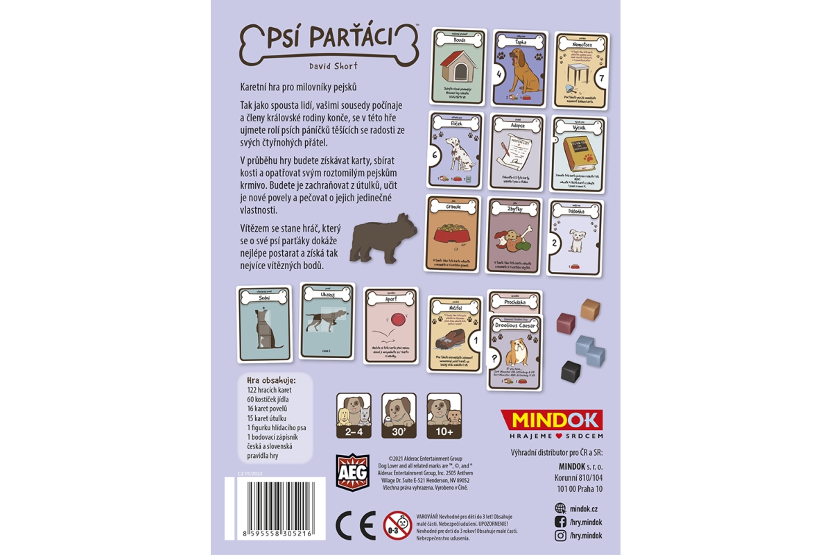 Karetní hra pro milovníky pejsků. Tak jako spousta lidí, vašimi sousedy počínaje a členy královské rodiny konče, se v této hře ujmete rolí psích páníčků těšících se radosti ze svých čtyřnohých přátel. V průběhu hry budete získávat karty, sbírat kosti a opatřovat svým roztomilým pejskům krmivo. Budete je zachraňovat z útulků, učit je nové povely a pečovat o jejich jedinečné vlastnosti. Vítězem se stane hráč, který se o své psí parťáky dokáže nejlépe postarat a získá tak nejvíce vítězných bodů. Rozměr balení cca 19,5 x 14,5 x 5 cm. Věk 10+