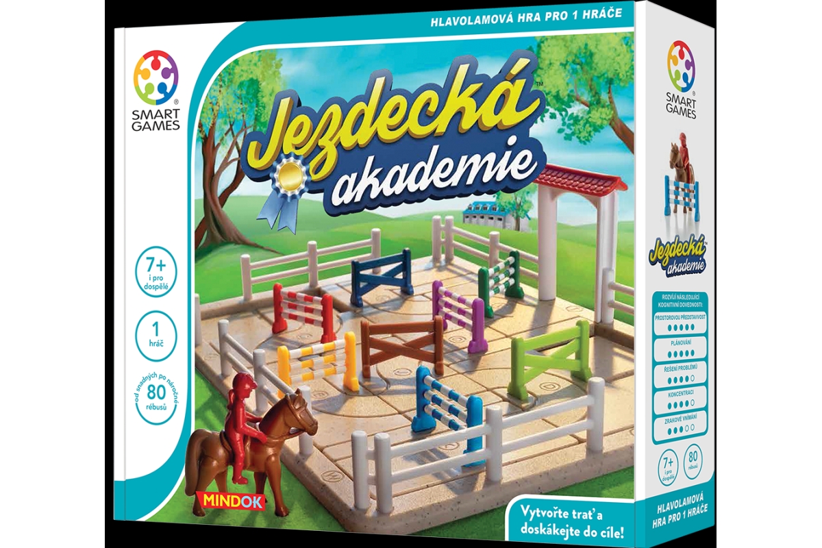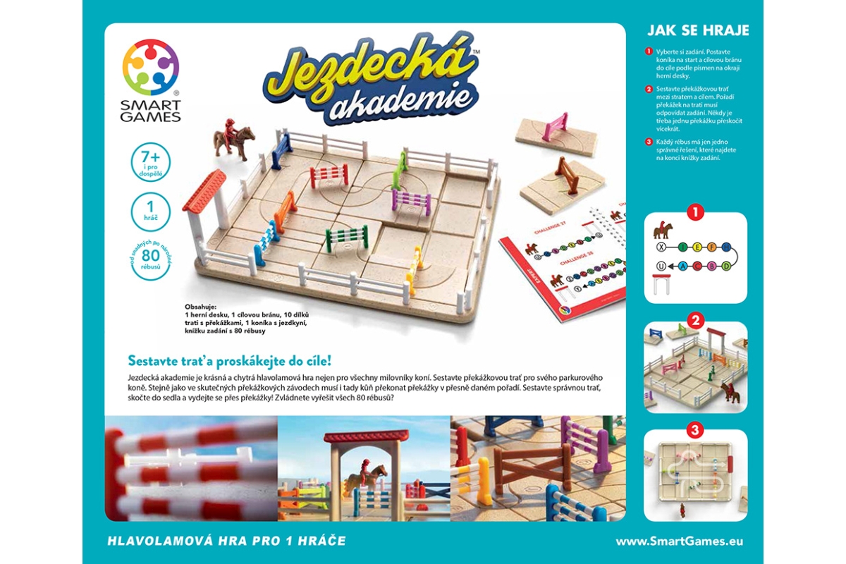 Sestavte trať a proskákejte do cíle! Jezdecká akademie je krásná a chytrá hlavolamová hra nejen pro všechny milovníky koní. Sestavte překážkovou trať pro svého parkurového koně. Stejně jako ve skutečných překážkových závodech musí i tady kůň překonat překážky v přesně daném pořadí. Sestavte správnou trať, skočte do sedla a vydejte se přes překážky! Zvládnete vyřešit všech 80 rébusů? Věk 7+
