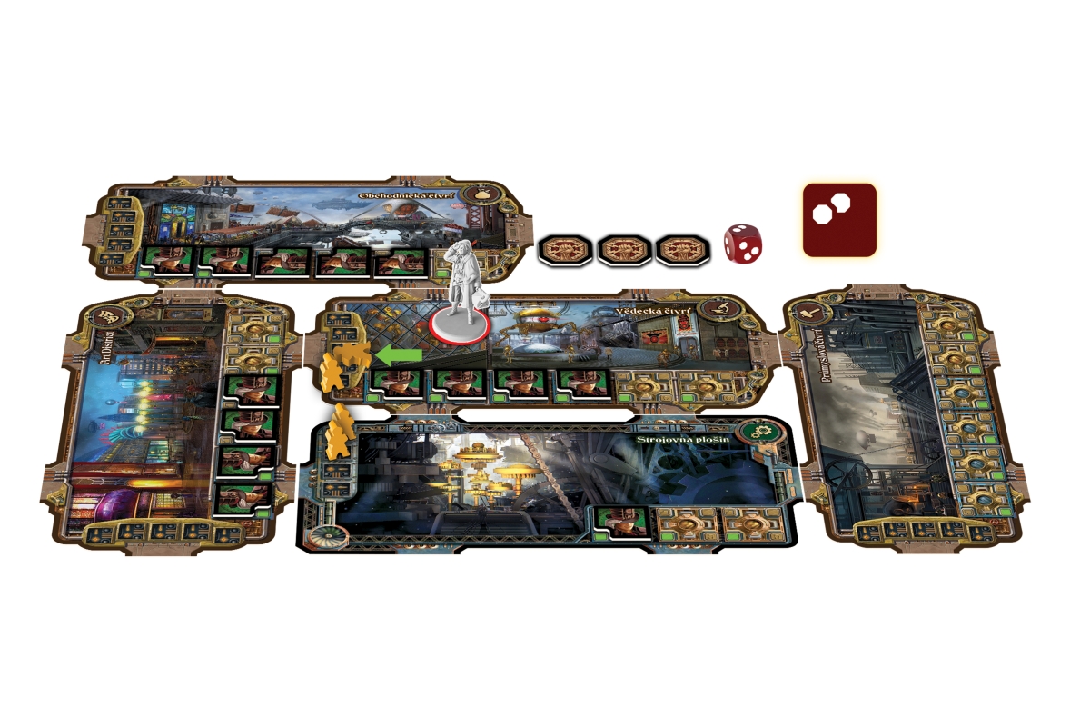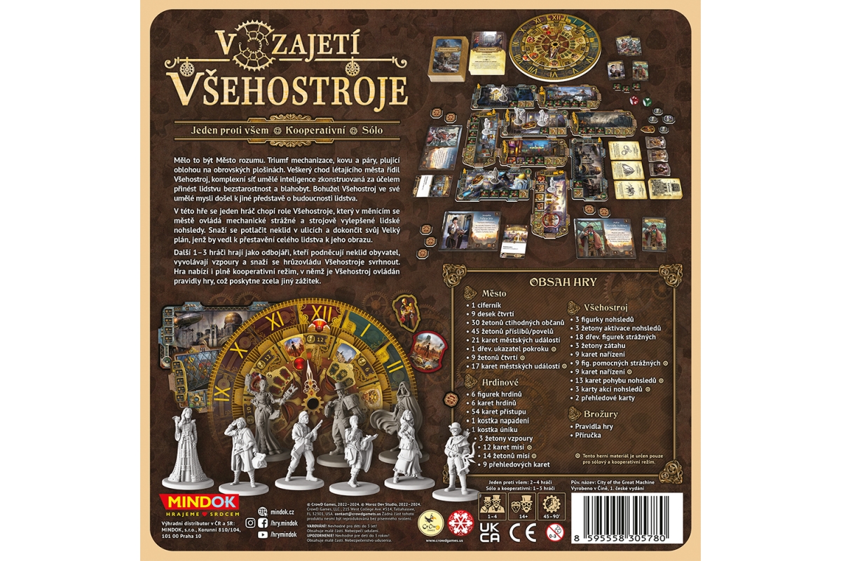 Koncem 19. století se nejlepší mozky lidstva spojily, aby vybudovaly utopické mechanické město. Triumf spojení vědy, techniky a páry pluje oblohou na obrovských plošinách. Veškerý chod létajícího města řídí Všehostroj, komplexní síť umělé inteligence určená k tomu, aby přinesla lidstvu blahobyt. Bohužel Všehostroj ve své umělé mysli došel k jiné představě o budoucnosti… V této hře „jeden proti všem“ se 1-3 odbojáři utkají se zdánlivě všemocným Všehostrojem a jeho armádou mechanických strážných. Jejich úkolem bude získat na svou stranu vlivné občany a vyvolat revoluci. V roli odbojářů musíte strategicky plánovat pohyb po městě, využívat speciální schopnosti hrdinů a odhalovat skryté identity obyvatel. Jako Všehostroj naopak předvídat další kroky odboje. Kdo zvítězí, hrdinové snažící se zachovat si lidství, či obří mechanický tyran? Určeno pro 1-4 hráče. Věk 14+