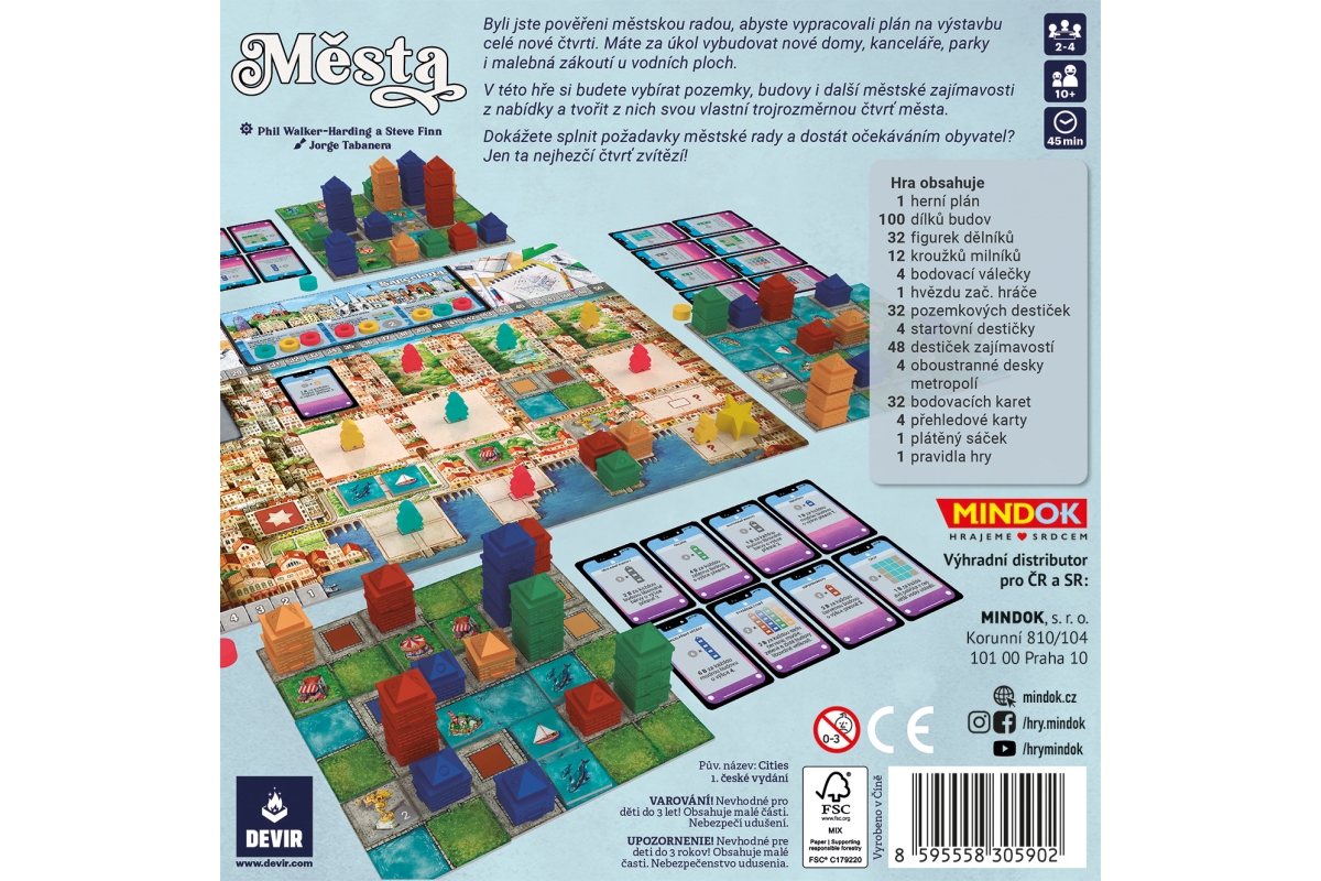 Města jsou strategická hra pro 1-4 hráče, ve které se stáváte architekty moderních čtvrtí. Vaším úkolem je chytře vybírat pozemky, budovy a zajímavost..