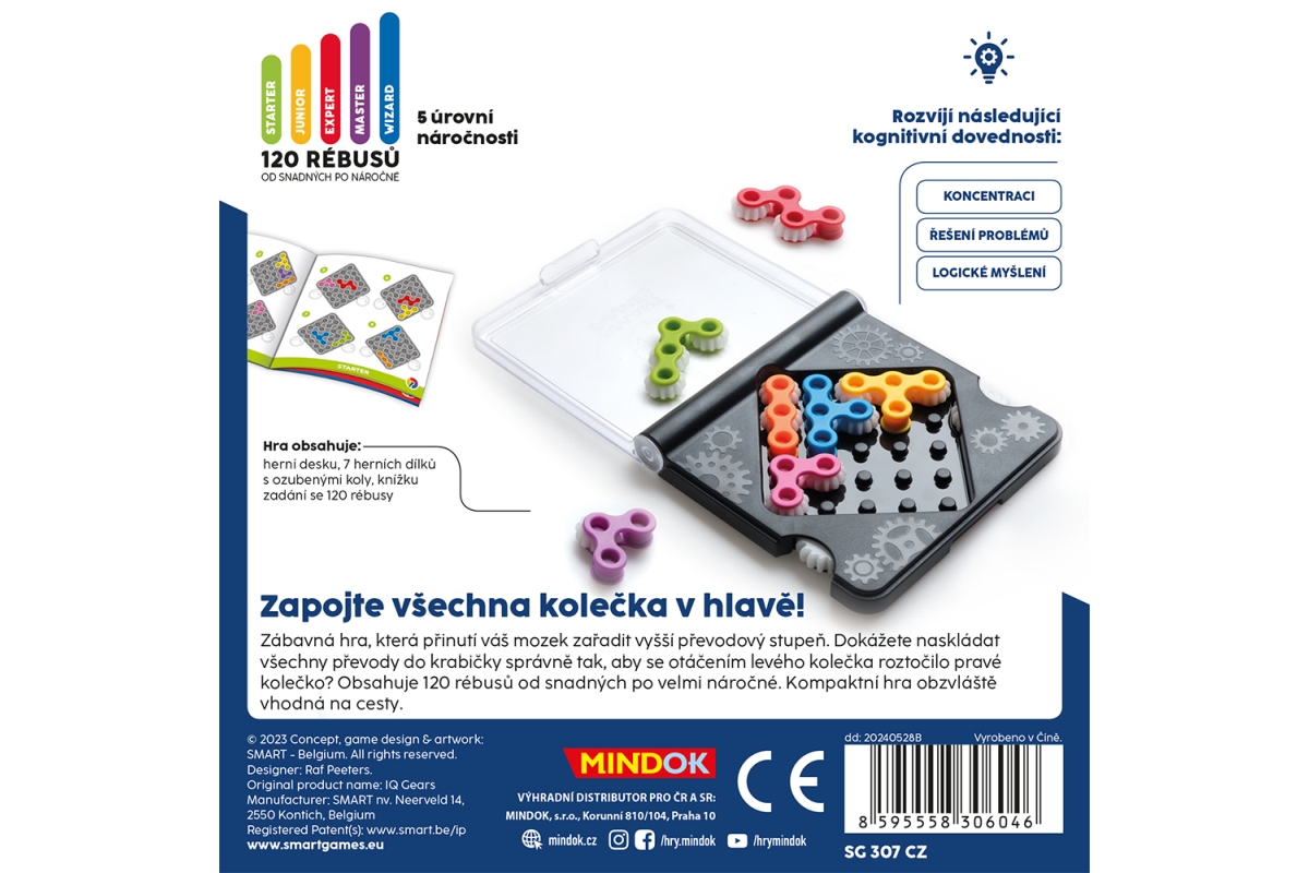 Zapojte všechna kolečka v hlavě! Zábavná hra, která přinutí váš mozek zařadit vyšší převodový stupeň. Dokážete naskládat všechny převody do krabičky správně tak, aby se otáčením levého kolečka roztočilo pravé kolečko? Obsahuje 120 rébusů od snadných po velmi náročné. Kompaktní hra obzvláště vhodná na cesty. Věk 7+