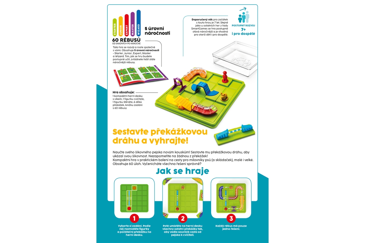 Sestavte překážkovou dráhu a vyhrajte! Naučte svého šikovného pejska novým kouskům! Sestavte mu překážkovou dráhu, aby ukázal svou šikovnost. Nezapomeňte na žádnou z překážek! Kompaktní hra v praktickém balení na cesty pro milovníky psů (a skládaček), malé i velké. Obsahuje 60 úloh. Vyčenicháte všechna řešení správně? Určeno pro 1 hráček. Věk 7+
