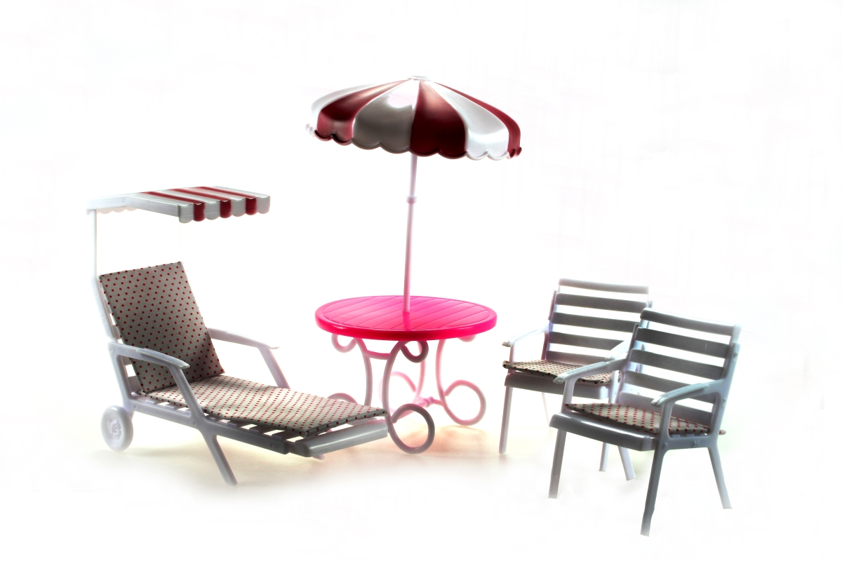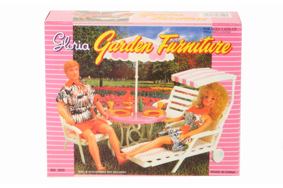 Glorie Zahradní nábytek obsahuje plastové lehátko o rozměrech cca 9,5 cm X 22 cm X 18 cm,dvě plastové zahradní židličky o velikosti cca 8,5 cm X 9 cm X 12 cm a plastový zahradní stolek o výšce cca 9 cm se slunečníkem o výšce cca 16 cm.Panenka,panáček a nádobí na stolečku nejsou součástí balení.Věk 3+