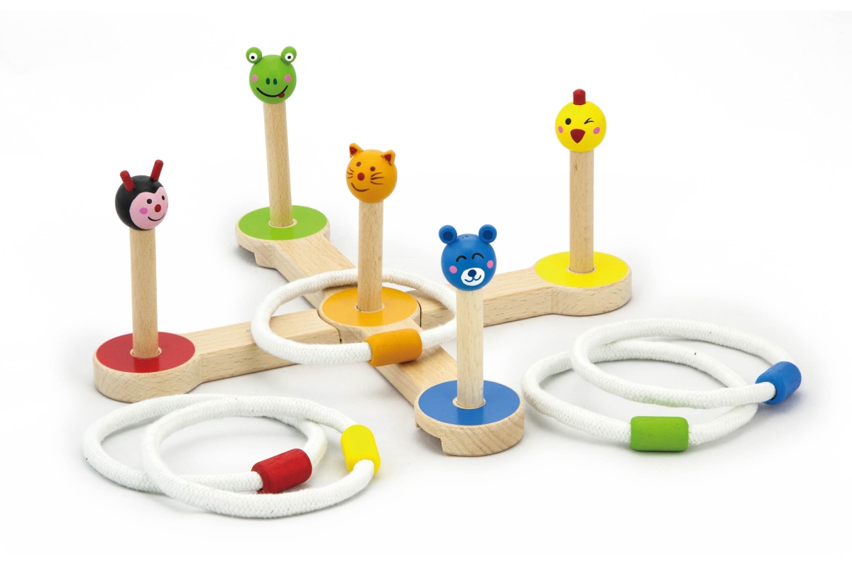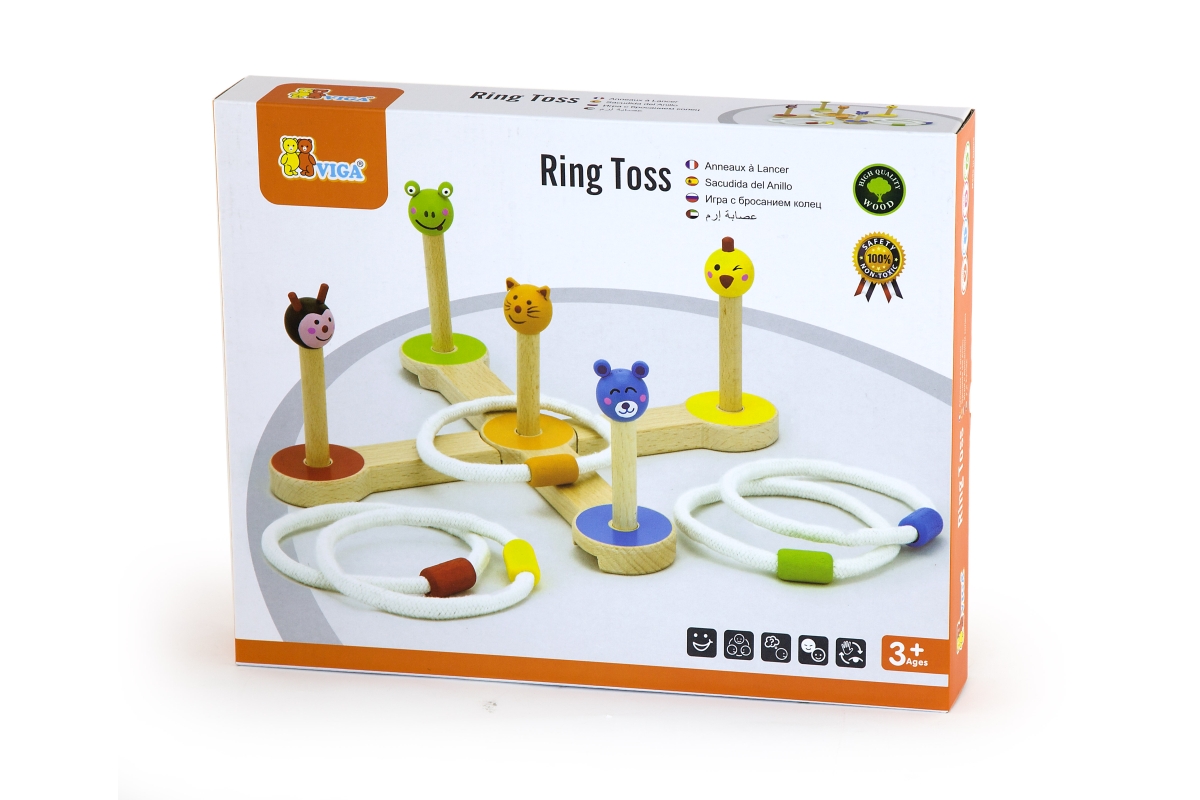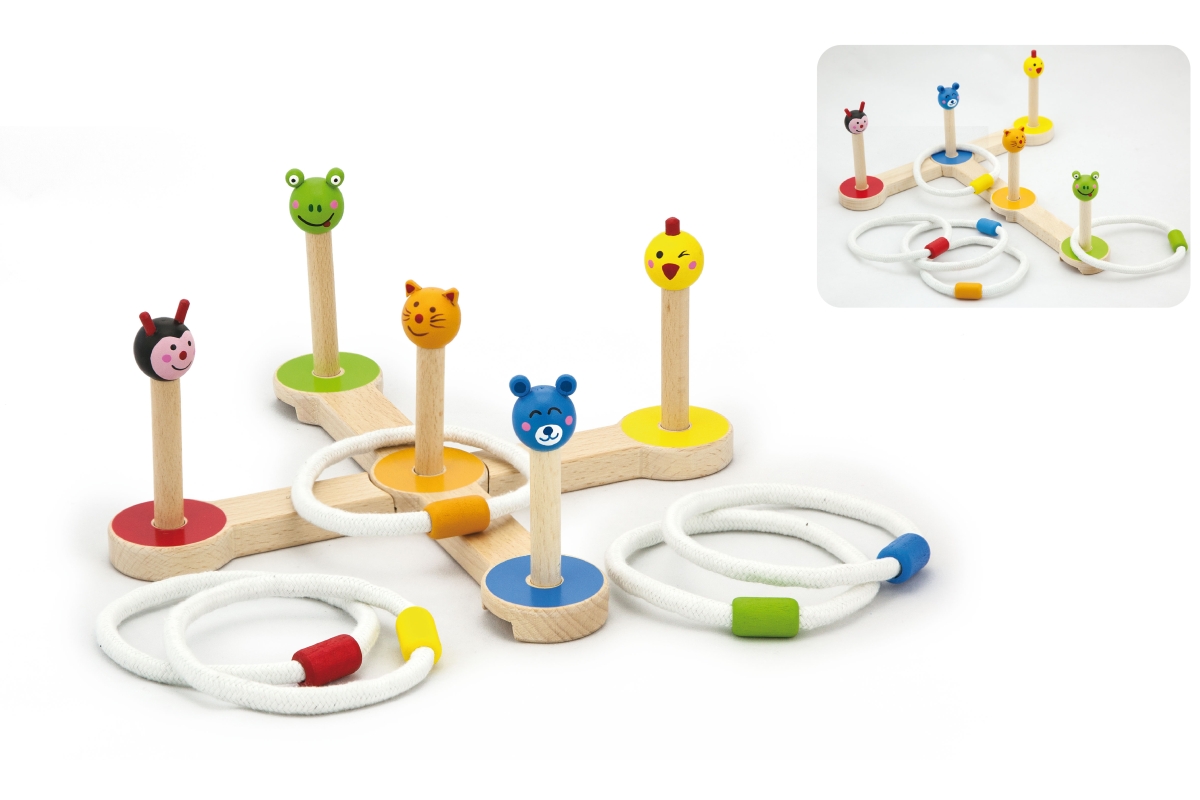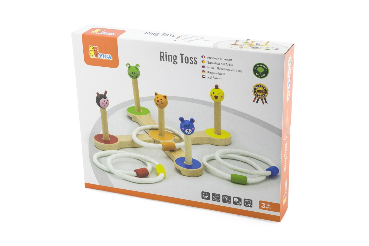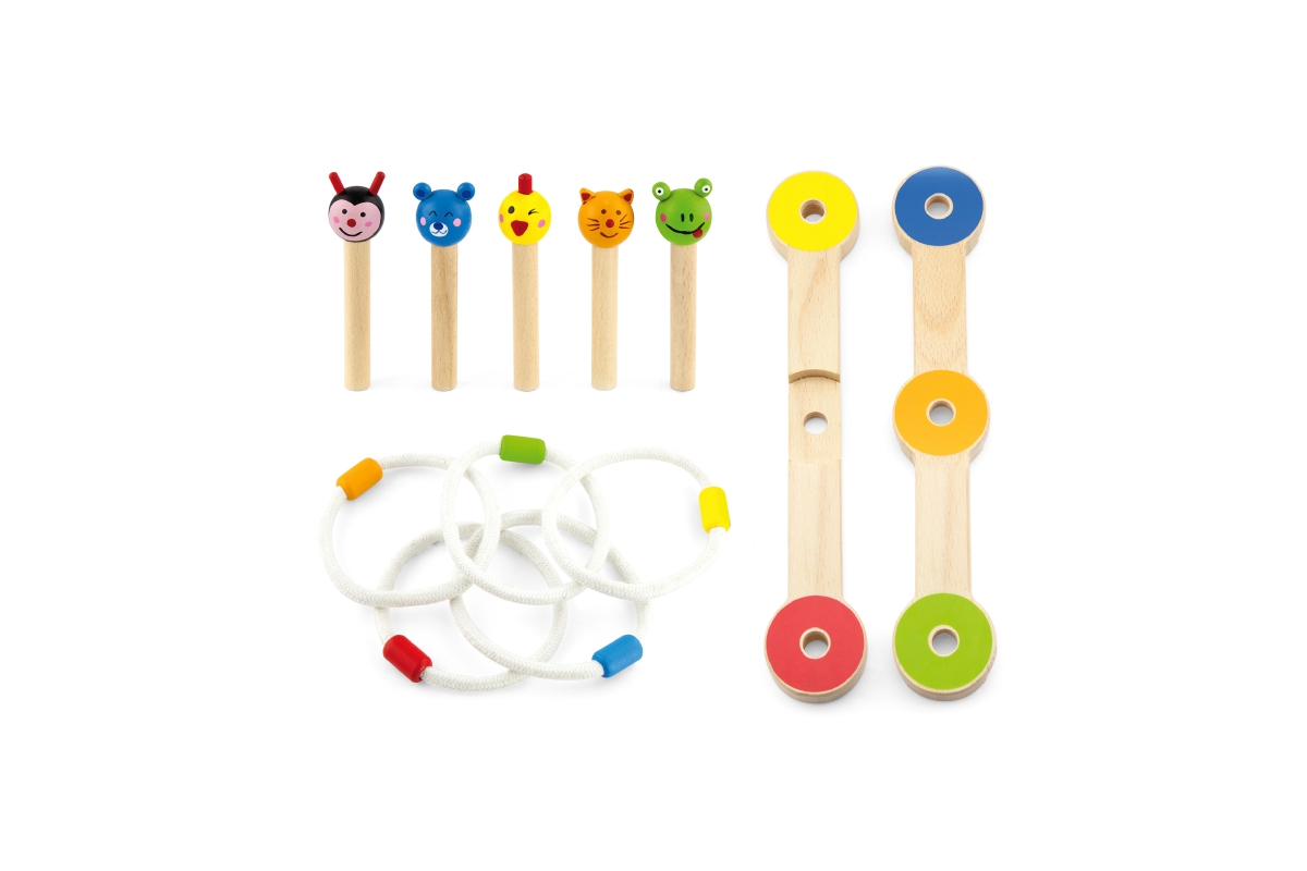 Dřevěná hra házení kroužků. Rozměry cca 28 x 2 x 10,5 cm. Rozměry balení cca 32,5 x 26 x 5 cm. Věk 3+..