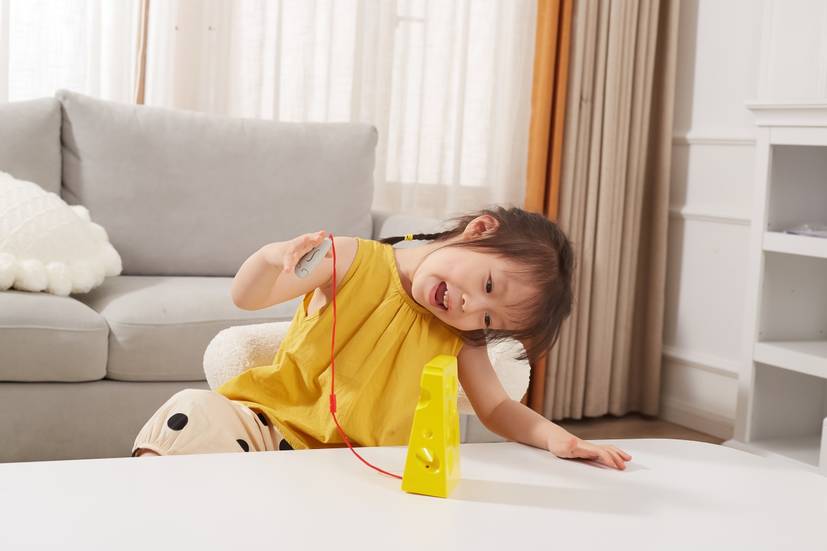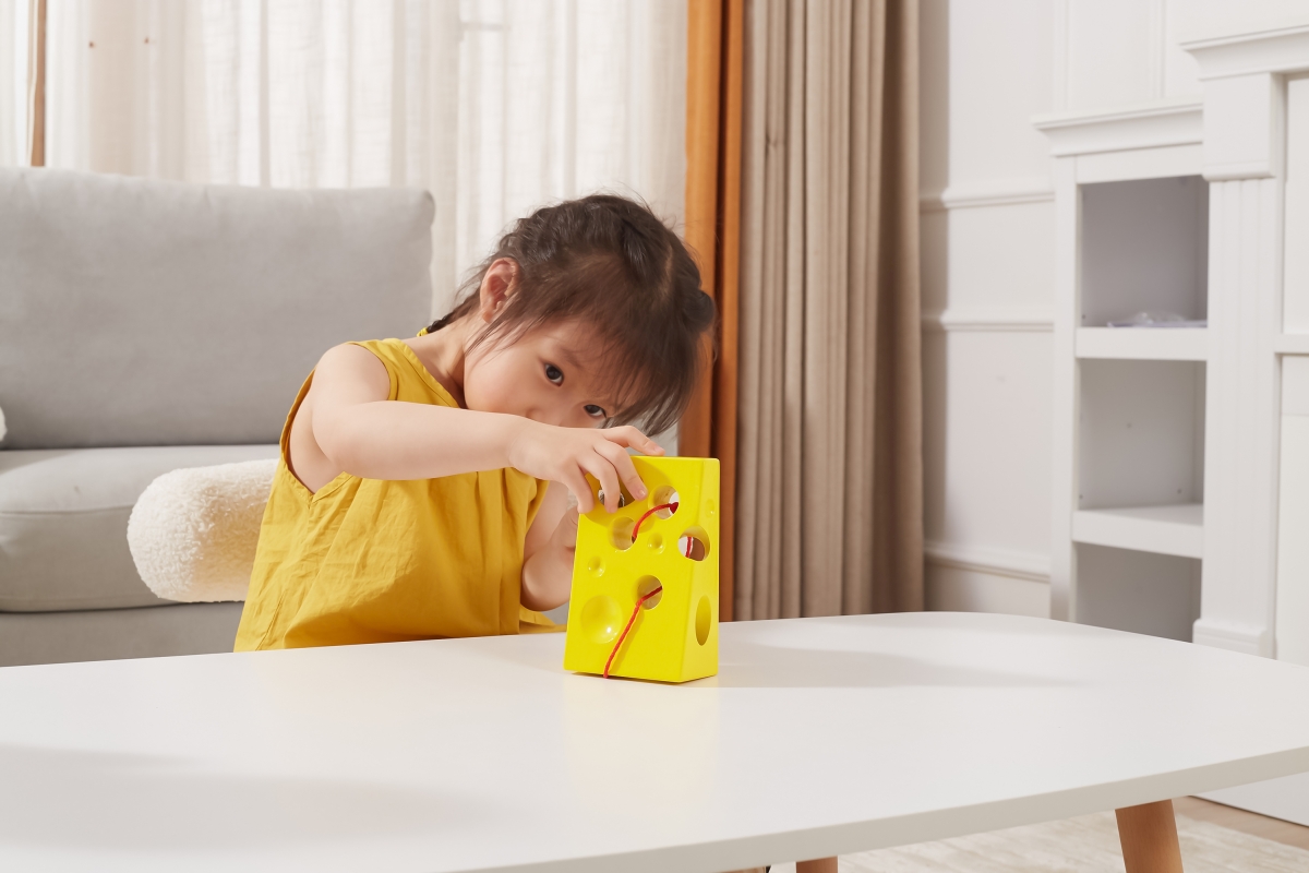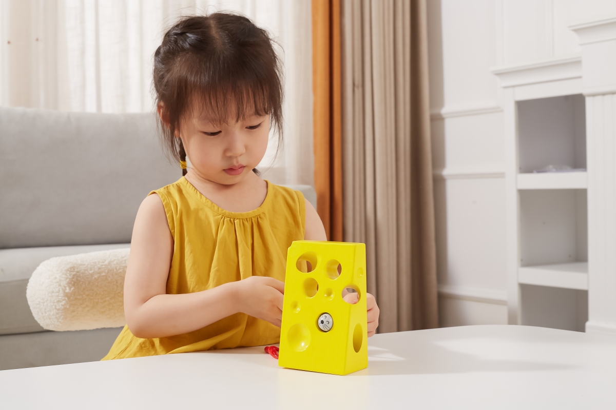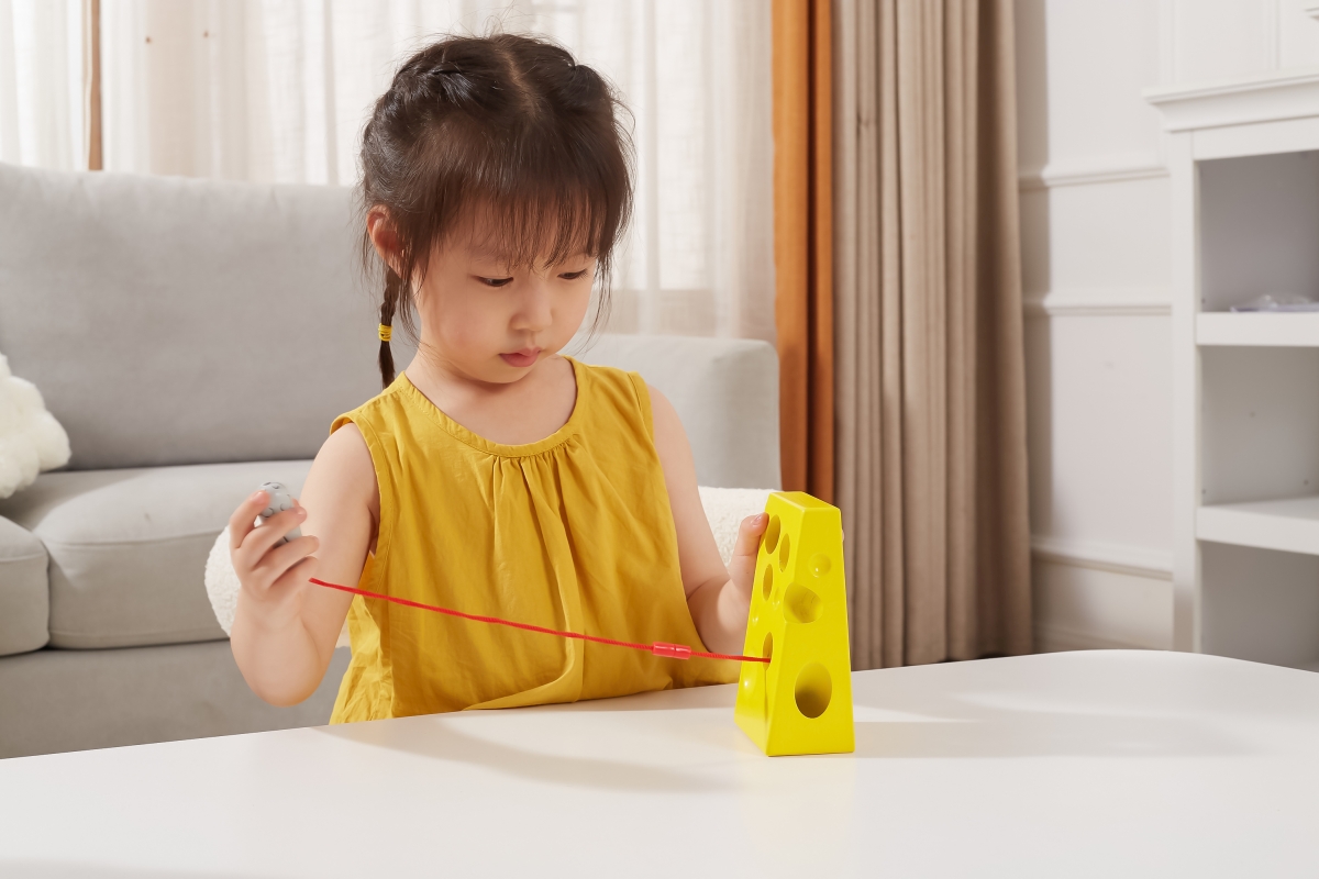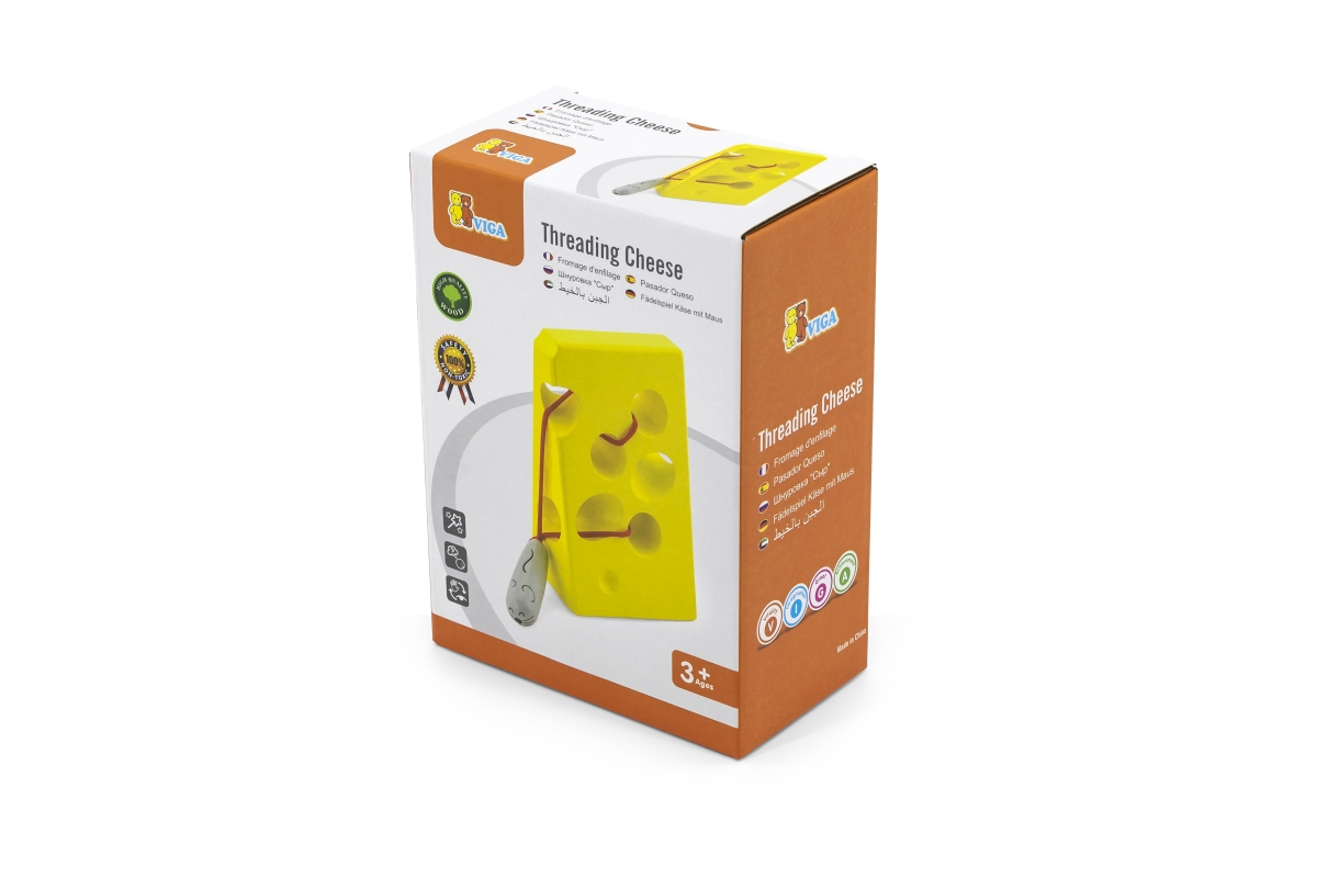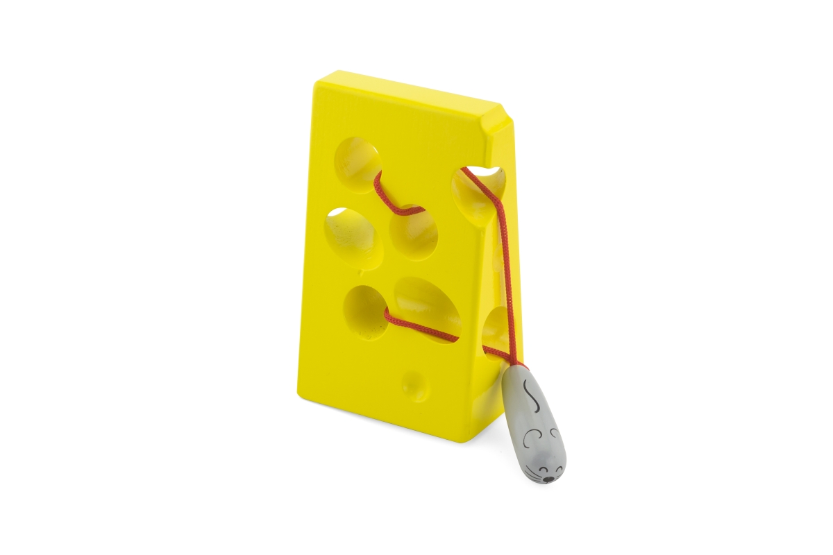 Provlékačka ve tvaru sýra se šňůrkou ,na které je myš.Velikost sýra cca 9 x 14 cm.Rozměr balení cca 13 x 18 x 7,5 xm.Věk 3 +..