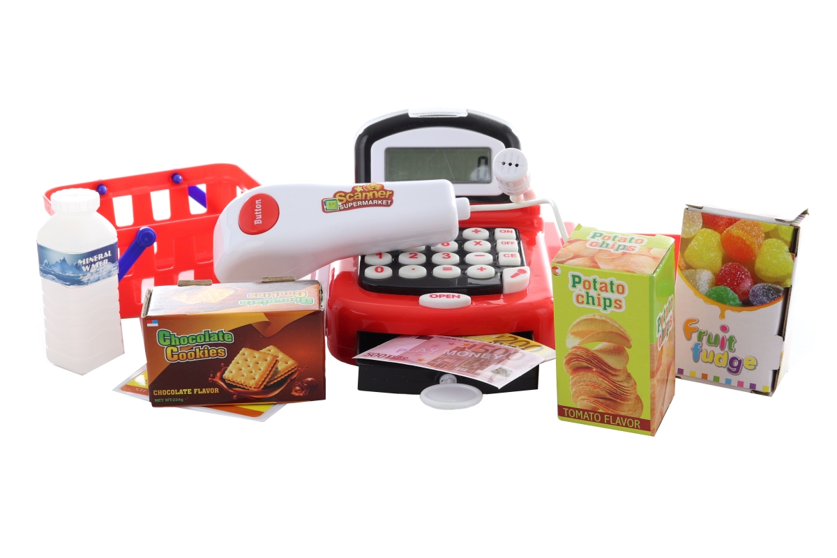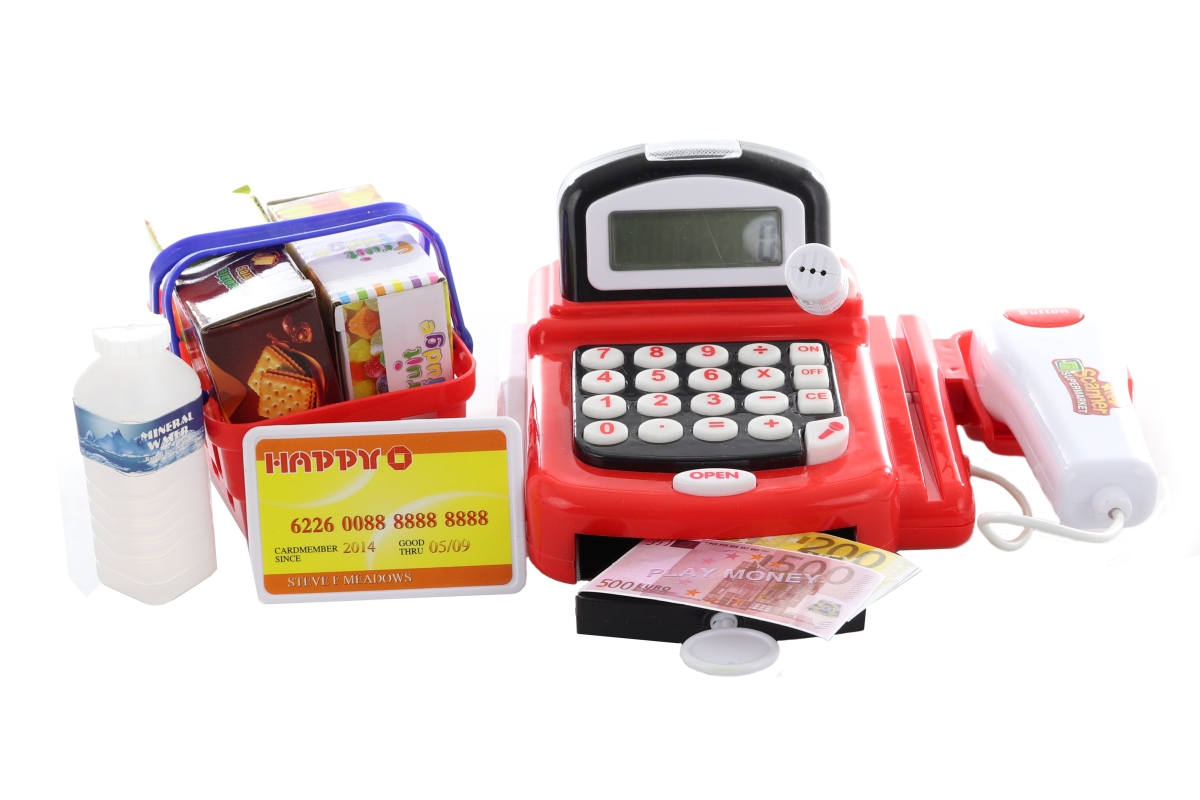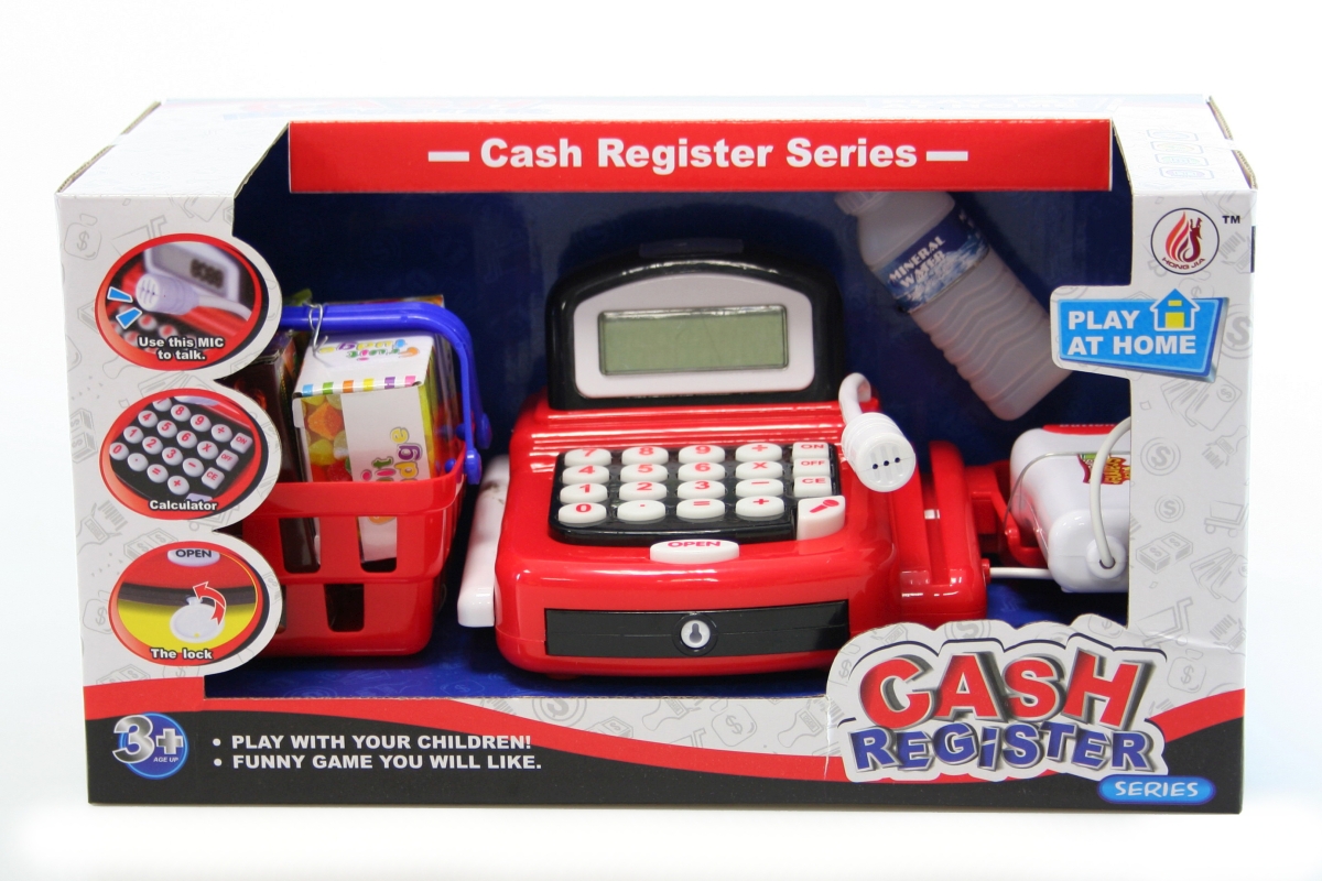 Kasa na baterie červená o velikosti cca 18 cm x 14 cm se čtečkou na zboží. Dále set obsahuje košíček potravin, peníze, platební kartu a plastovou lahev. Provoz na 2 baterie AA (nejsou součástí balení). Pokladna funguje jako kalkulačka, skener a mikrofon. Rozměr balení cca 30,5 x 16 x 15,5 cm. Věk 3+