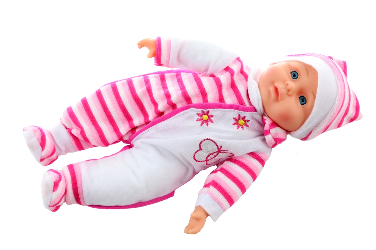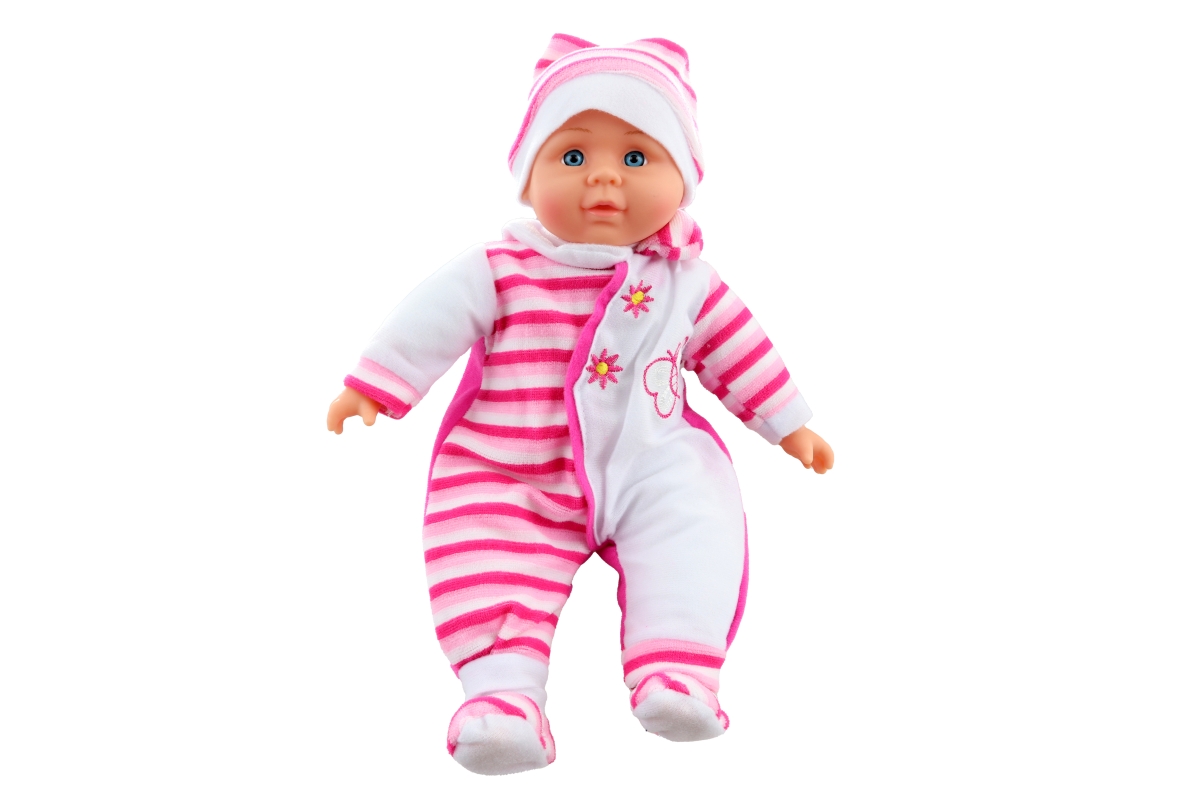 Miminko s měkkým tělíčkem. Miminko je oblečeno do barevného pyžámka, které lze sundat (suchý zip). Rozměry miminka cca 35 x 17 x 8 cm. Baleno v plasto..
